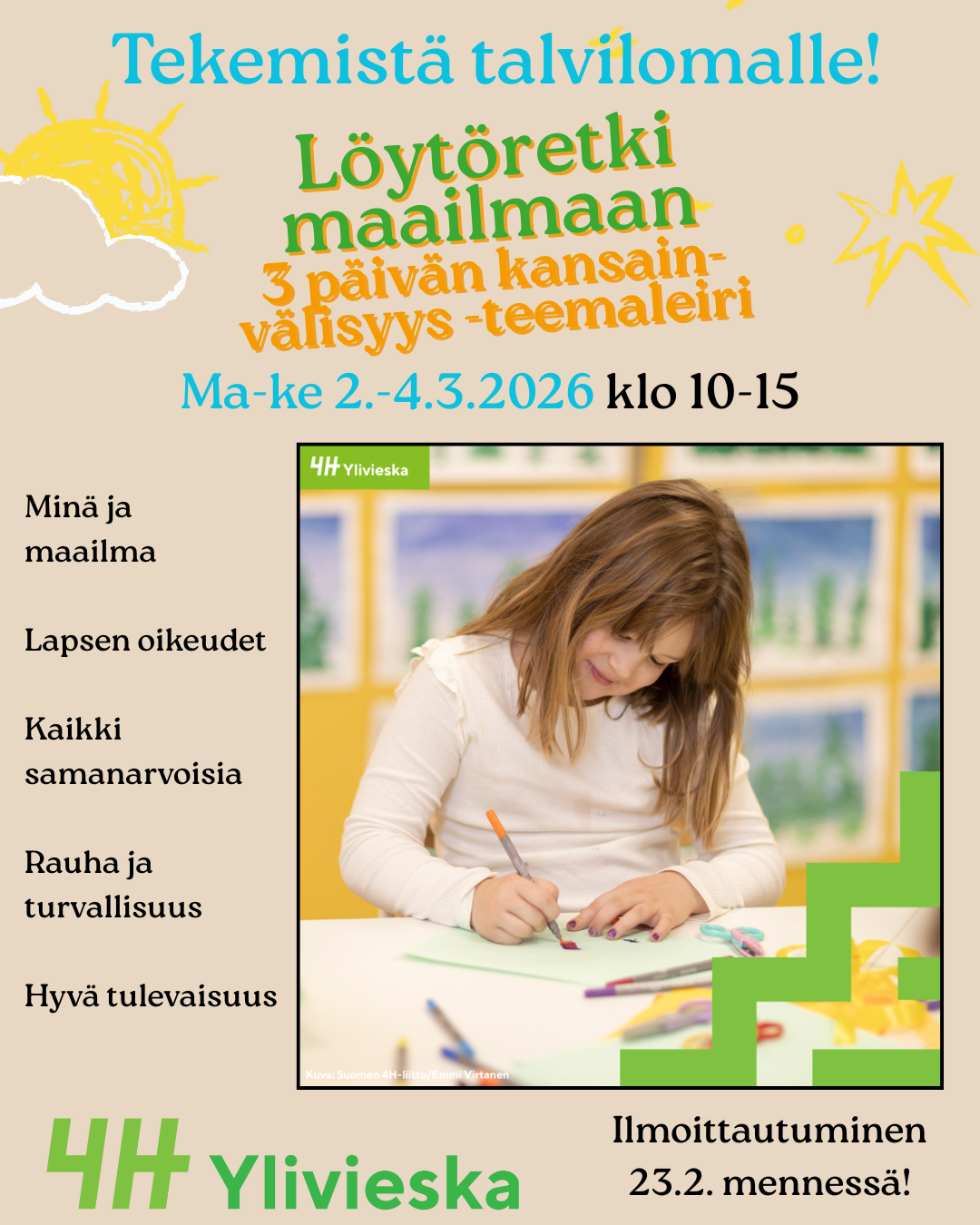 Kolme kivaa päivää ohjatusti kansainvälisyysteeman ympärillä touhuten ja ruokia maistellen. Sitovat ilmoittautumiset 23.2. mennessä. Leiri toteutuu mikäli osallistujia tulee vähintään 6.…