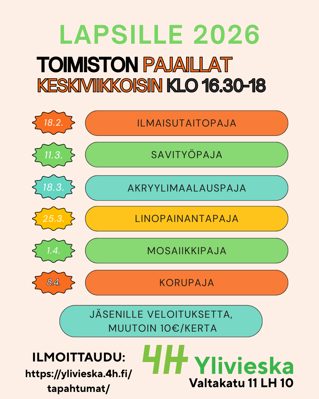 Kevätkausi alakouluikäisille suunnatuissa toimiston pajoissa pärähtää käyntiin 18.2. Kuusi pajaa, eri teemoin. Ilmoittautumiset ja tarkemmat pajakohtaiset tiedot löytyvät tapahtumat osiosta Tapahtumat…