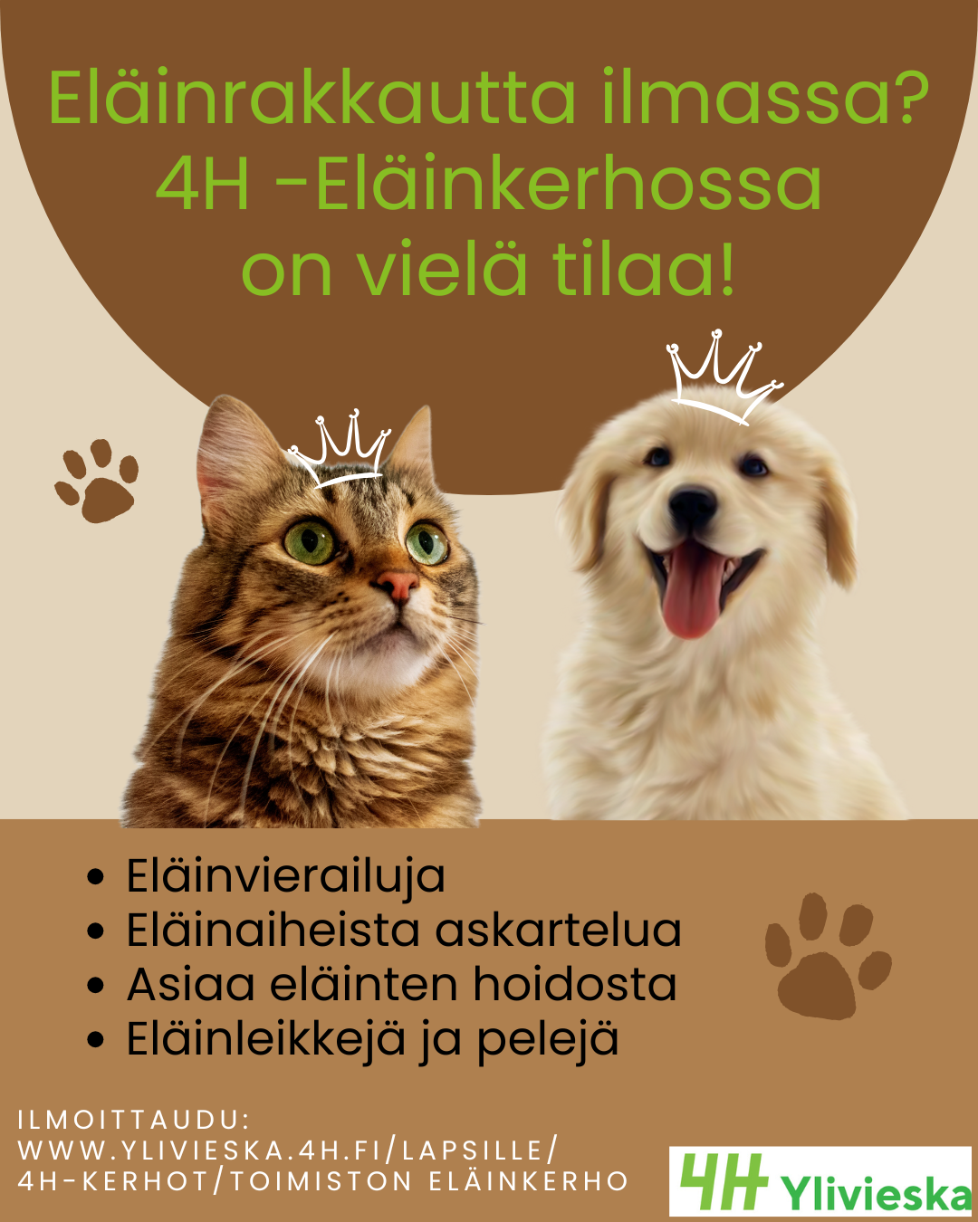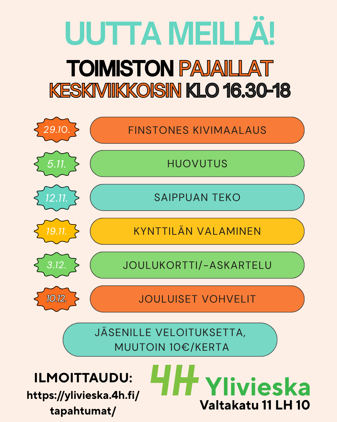 Tsekkaa vapaat 4H-kerhopaikat linkistä: 4H-kerhot - Ylivieskan 4H-yhdistys ja ilmoittaudu menoon mukaan.
